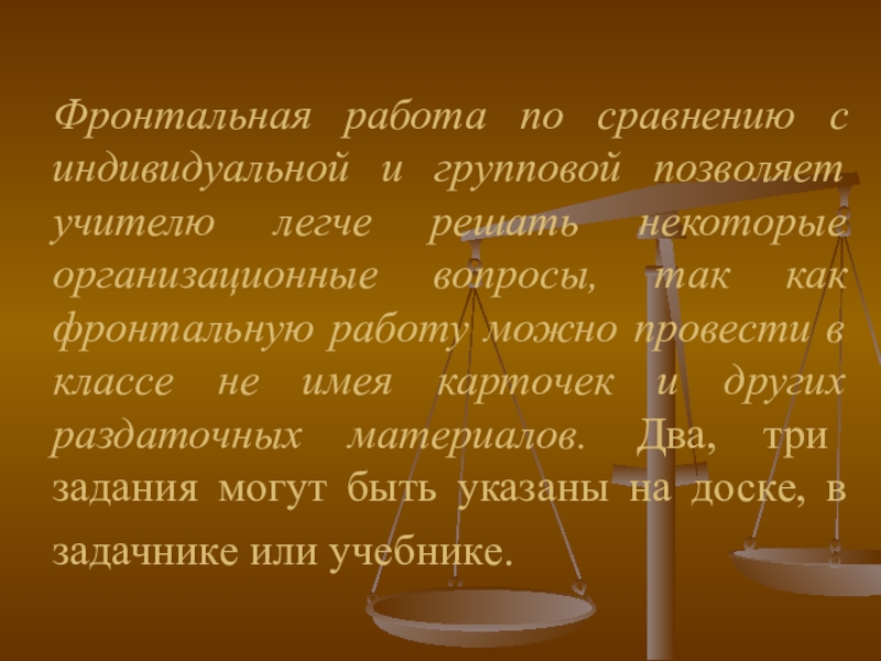 Слайд 9Фронтальная работа по сравнению с индивидуальной и групповой позволяет учителю легче