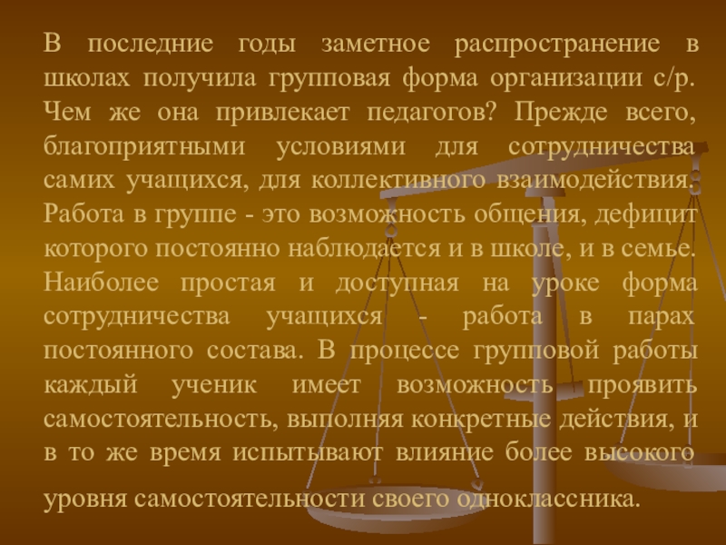 с/р. Чем же она привлекает педагогов? Прежде всего, благоприятными условиями для сотрудничества самих учащихся, для коллективного взаимодействия. Работа в группе - это возможность общения, дефицит которого постоянно наблюдается и в школе, и в семье. Наиболее простая и доступная на уроке форма сотрудничества учащихся - работа в парах постоянного состава. В процессе групповой работы каждый ученик имеет возможность проявить самостоятельность, выполняя конкретные действия, и в то же время испытывают влияние более высокого уровня самостоятельности своего одноклассника.