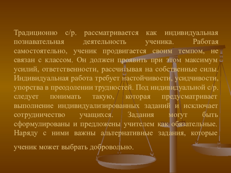 Слайд 10Традиционно с/р. рассматривается как индивидуальная познавательная деятельность ученика. Работая самостоятельно, ученик