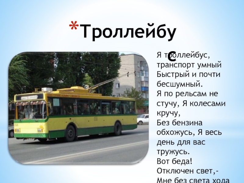 Я троллейбус, транспорт умный Быстрый и почти бесшумный.