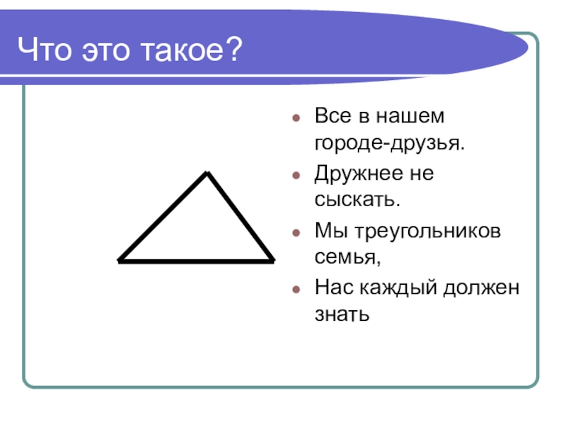 Что это такое?Все в нашем городе-друзья.Дружнее не сыскать.Мы треугольников семья,Нас каждый должен знать