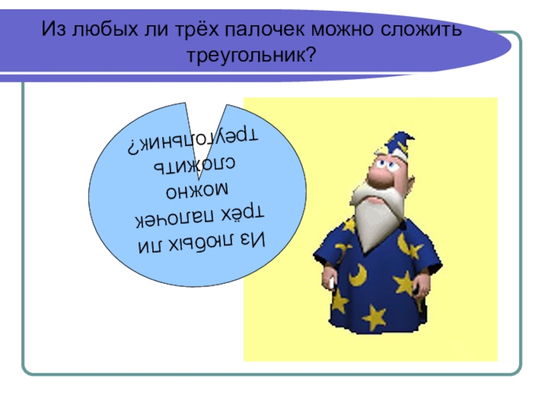 Слайд 7Из любых ли трёх палочек можно сложить треугольник?