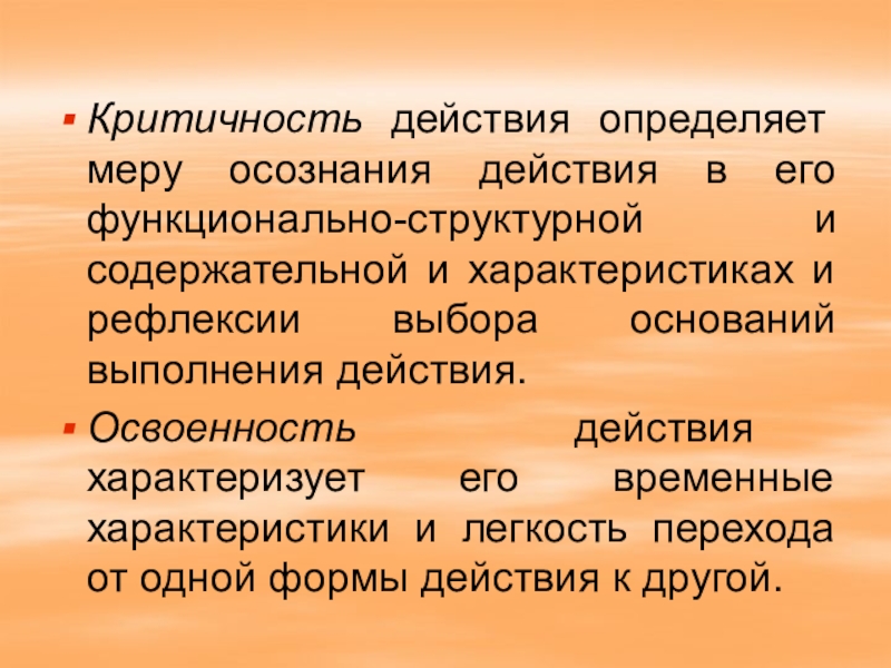 Слайд 47Критичность действия определяет меру осознания действия в его функционально-структурной и содержательной