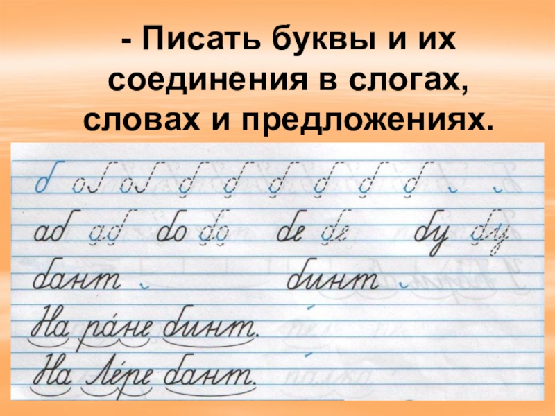 Слайд 21- Писать буквы и их соединения в слогах, словах и предложениях.