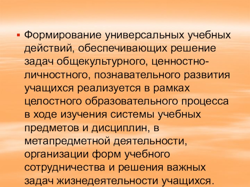 Слайд 49Формирование универсальных учебных действий, обеспечивающих решение задач общекультурного, ценностно- личностного, познавательного