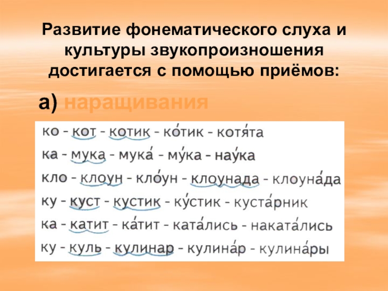 Слайд 22Развитие фонематического слуха и культуры звукопроизношения достигается с помощью приёмов: