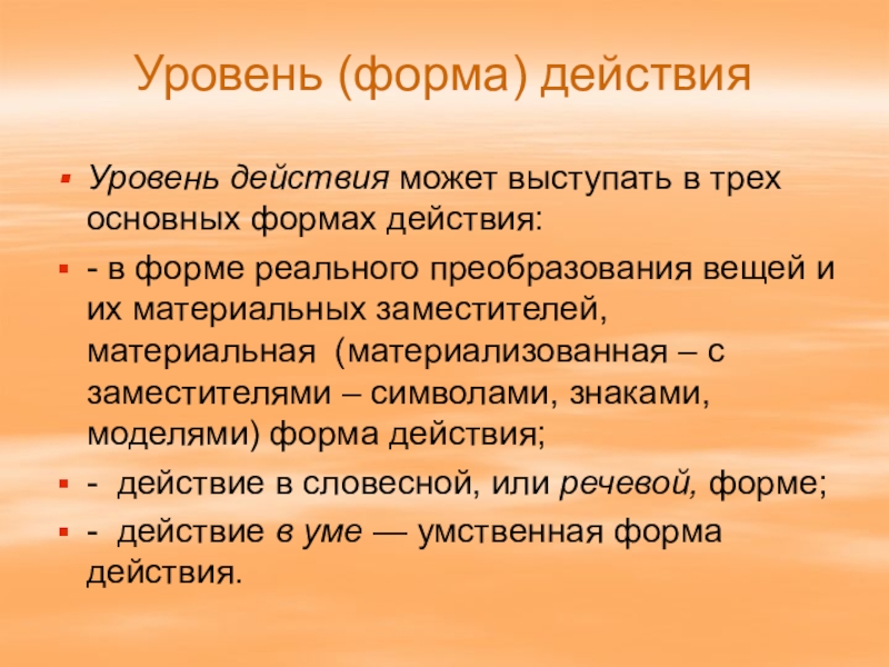 Уровень действия может выступать в трех основных формах действия: