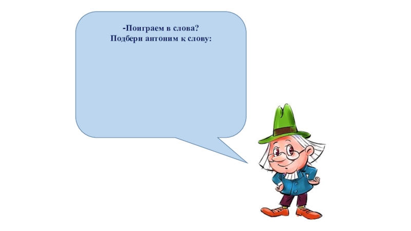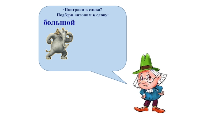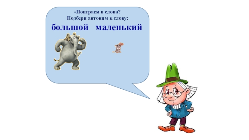 -Поиграем в слова?Подбери синонимы к слову:маленькиймалюсенький, крохотный, мизерныйбольшой огромный,