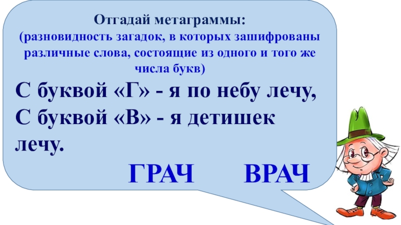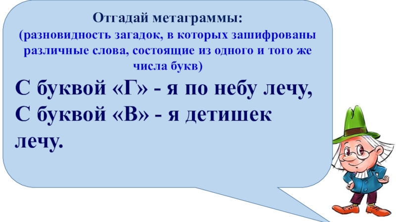Отгадай метаграммы:(разновидность загадок, в которых зашифрованы различные слова, состоящие из одного и того же числа букв) С буквой «Г»