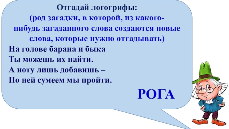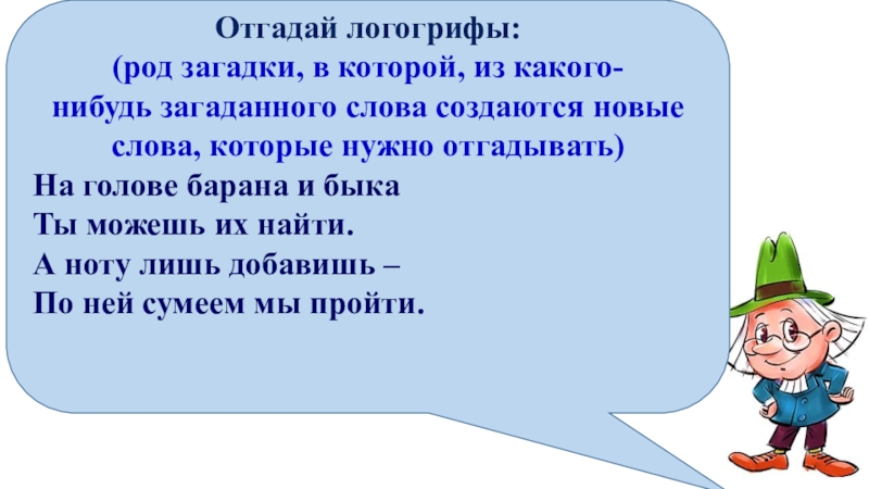 Отгадай логогрифы:(род загадки, в которой, из какого-нибудь загаданного слова создаются новые слова, которые нужно отгадывать)На голове барана и быкаТы можешь их найти.А ноту лишь добавишь – По ней сумеем