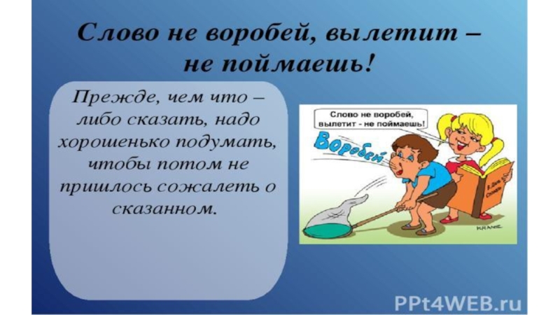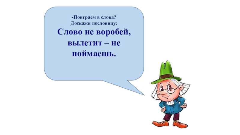 -Поиграем в слова?Доскажи пословицу:Слово не воробей, вылетит – не поймаешь.