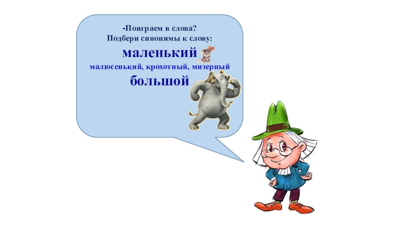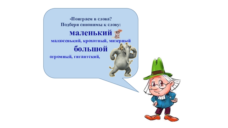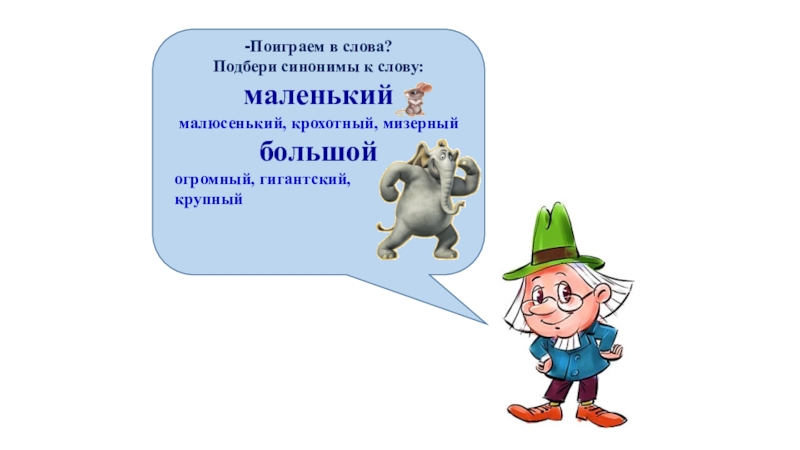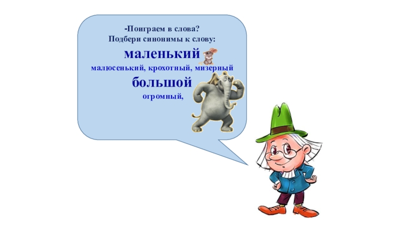 -Поиграем в слова?Подбери синонимы к слову:маленькиймалюсенький, крохотный, мизерныйбольшой огромный, гигантский, крупный