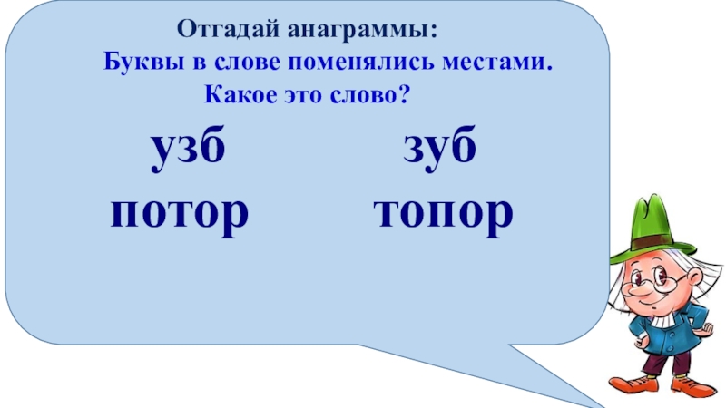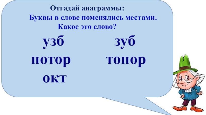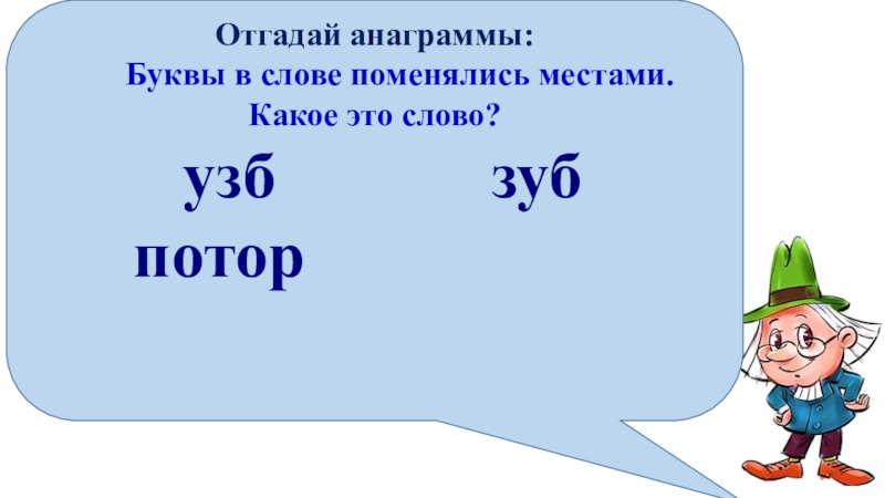 Отгадай анаграммы:Буквы в слове поменялись местами. Какое это слово? узб 	      зубпотор