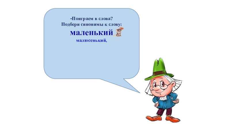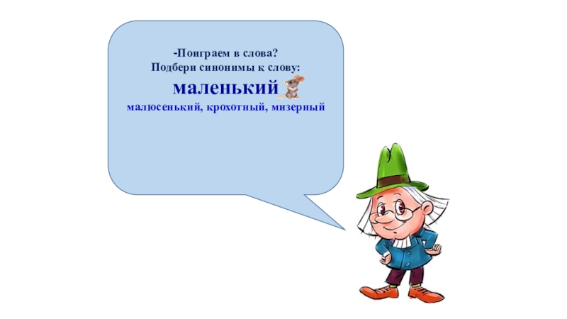 -Поиграем в слова?Подбери синонимы к слову:маленькиймалюсенький, крохотный, мизерный