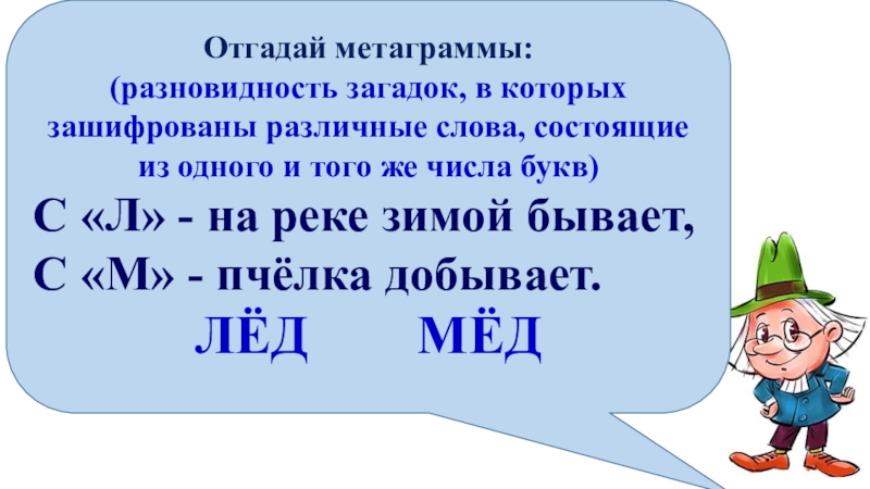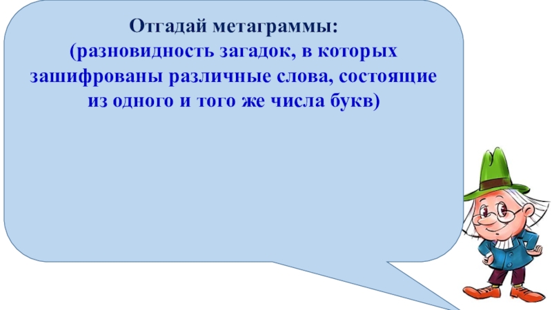 Отгадай метаграммы:(разновидность загадок, в которых зашифрованы различные слова, состоящие из одного и того же числа букв)