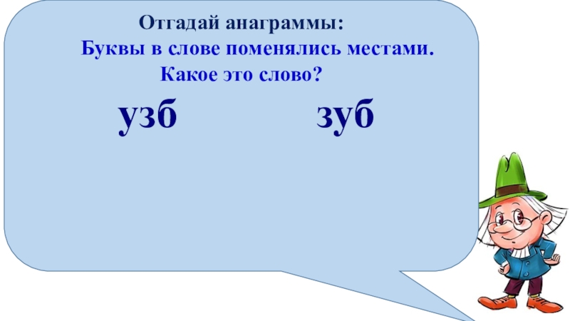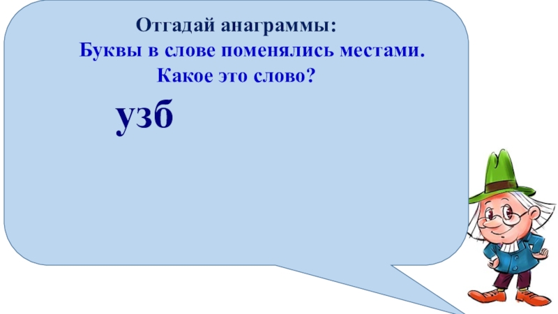 Отгадай анаграммы:   Буквы в слове поменялись местами. Какое это слово?     узб