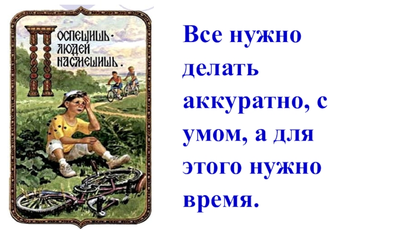 Слайд 23Все нужно делать аккуратно, с умом, а для этого нужно время.