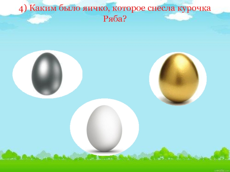 Слайд 114) Каким было яичко, которое снесла курочка Ряба?