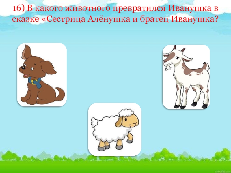 16) В какого животного превратился Иванушка в сказке «Сестрица Алёнушка и братец Иванушка?