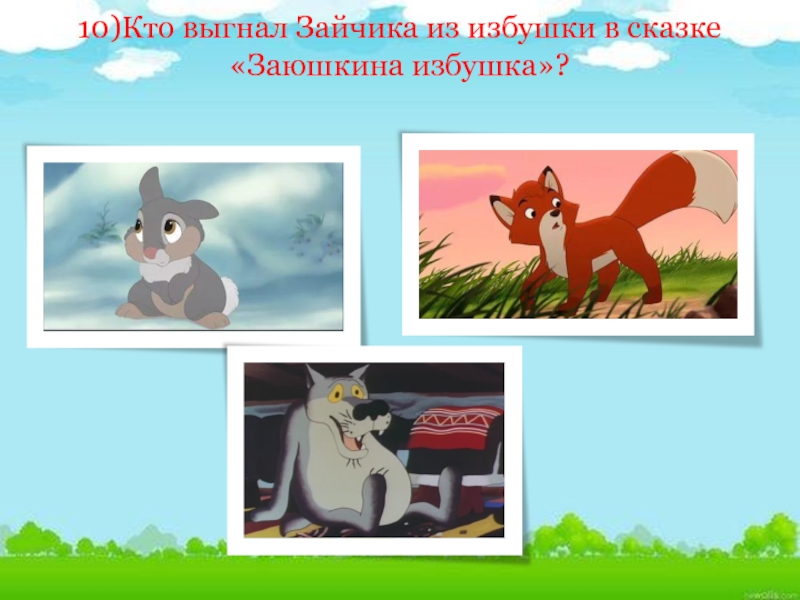Слайд 2310)Кто выгнал Зайчика из избушки в сказке «Заюшкина избушка»?