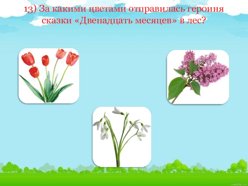 Слайд 3213) За какими цветами отправилась героиня сказки «Двенадцать месяцев» в лес?