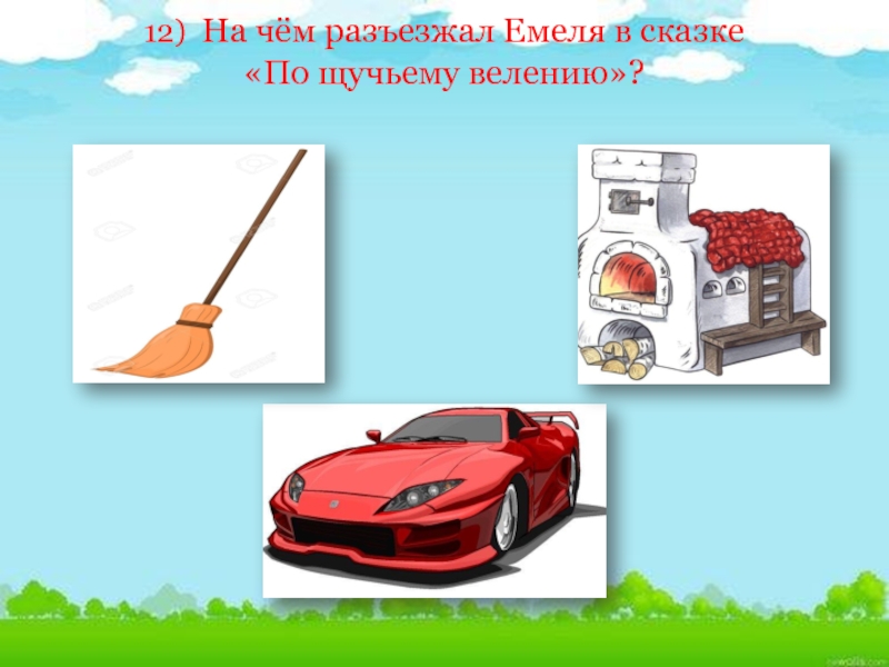 Слайд 2912)  На чём разъезжал Емеля в сказке «По щучьему велению»?