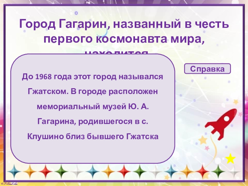 До 1968 года этот город назывался Гжатском. В городе расположен мемориальный музей Ю. А. Гагарина, родившегося в с. Клушино близ бывшего Гжатска