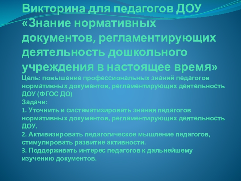 1. Уточнить и систематизировать знания педагогов нормативных документов, регламентирующих деятельность ДОУ.