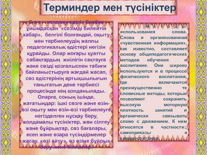 М е т о д ы использования слова. Слова и организованная «чувственная информация», как известно, составляет основу общепедагогических методов обучения и воспитания. Они широко используются и в процессе физического воспитания, где включаются преимущественно те словесные методы, которые позволяют сохранять высокую моторную плотность занятий и органически связывать слово с движением. К ним относятся в частности:, самоприказы и самовоспитания.