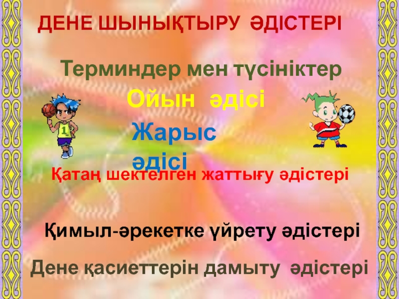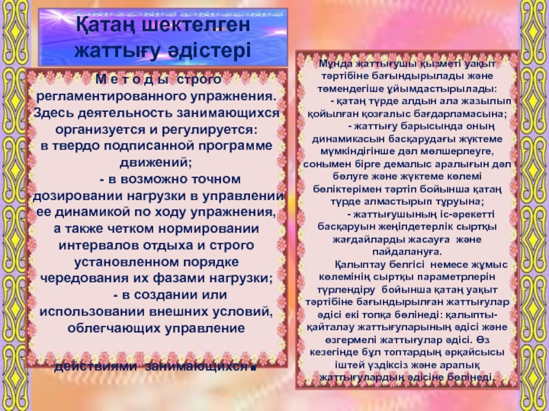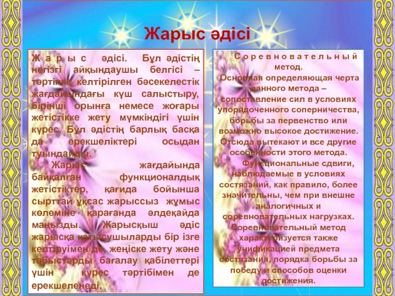 Ж а р ы с әдісі. Бұл әдістің негізгі айқындаушы белгісі – тәртіпке келтірілген бәсекелестік жағдайындағы күш салыстыру, бірінші орынға немесе жоғары жетістікке жету мүмкіндігі үшін күрес. Бұл әдістің барлық басқа да ерекшеліктері осыдан туындайды.
