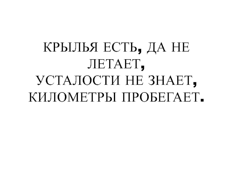 КРЫЛЬЯ ЕСТЬ, ДА НЕ ЛЕТАЕТ,УСТАЛОСТИ НЕ ЗНАЕТ,КИЛОМЕТРЫ ПРОБЕГАЕТ.