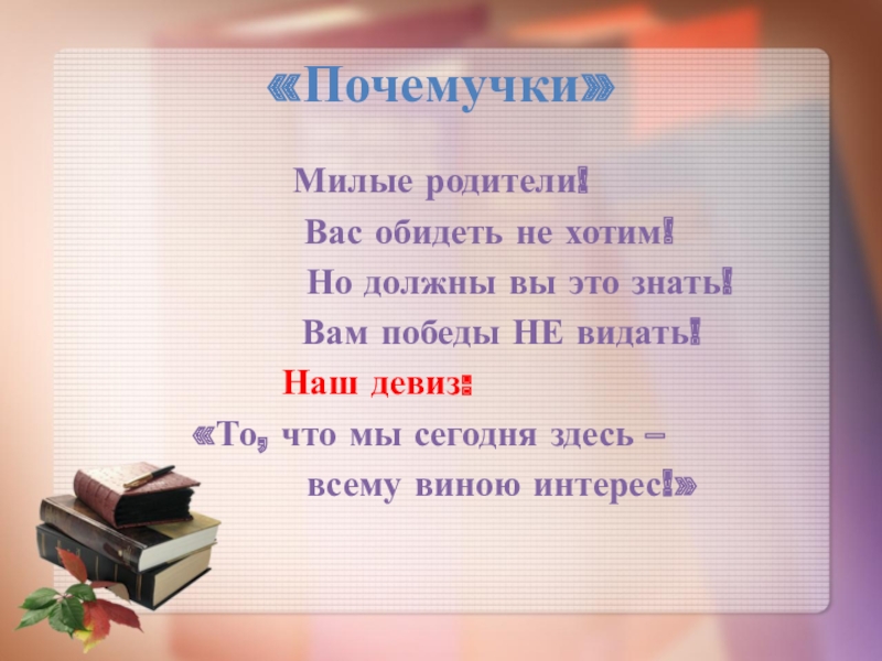 Это сайт презентаций, где можно хранить и обмениваться своими презентациями, докладами, проектами, шаблонами в формате PowerPoint с другими пользователями. Мы помогаем школьникам, студентам, учителям, преподавателям хранить и обмениваться учебными материалами.