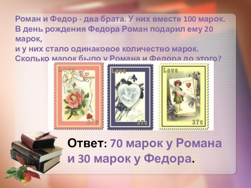 Ответ: 70 марок у Романа и 30 марок у Федора.