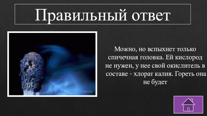 Правильный ответМожно, но вспыхнет только спичечная головка. Ей кислород не нужен, у нее свой окислитель в составе