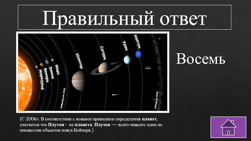 Правильный ответ Восемь(С 2006г. В соответствии с новыми правилами определения планет, считается что Плутон - не планета. Плутон — всего-навсего