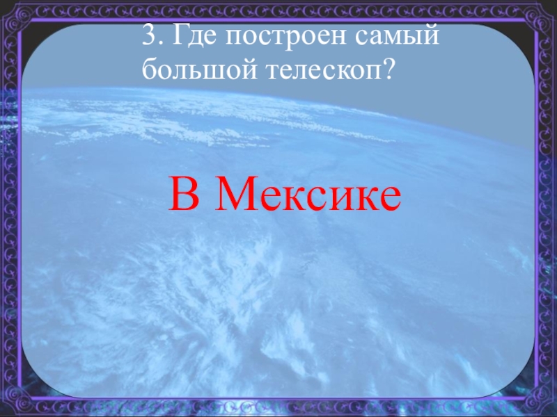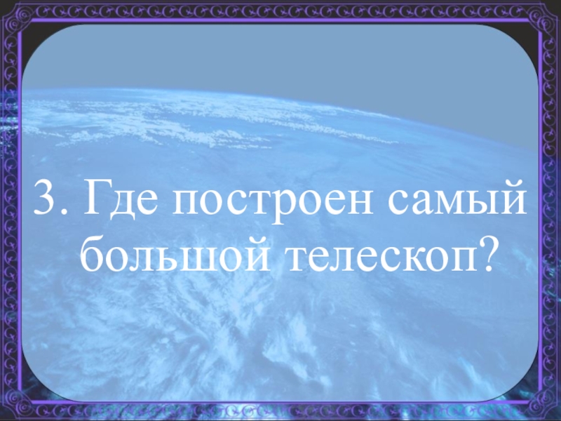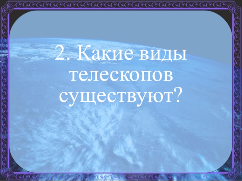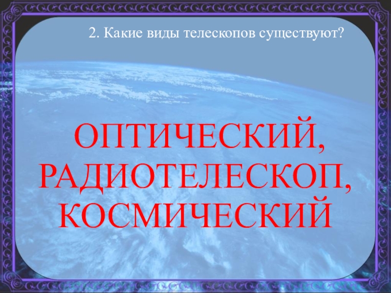 2. Какие виды телескопов существуют?  ОПТИЧЕСКИЙ, РАДИОТЕЛЕСКОП, КОСМИЧЕСКИЙ