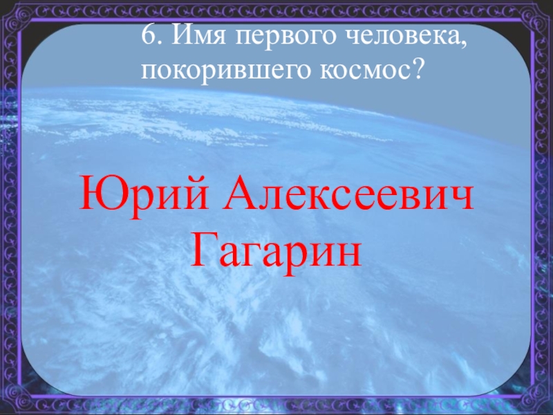 6. Имя первого человека, покорившего космос? Юрий Алексеевич Гагарин