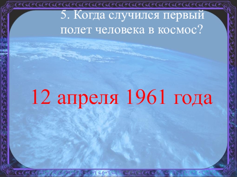 5. Когда случился первый полет человека в космос? 12 апреля 1961 года