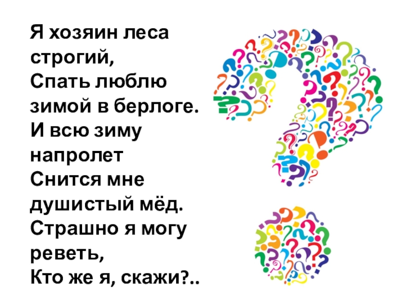 Я хозяин леса строгий,Спать люблю зимой в берлоге.И всю зиму напролетСнится мне душистый мёд.Страшно я могу реветь,Кто