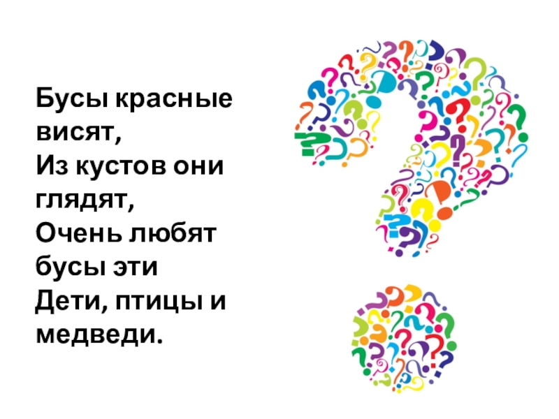 Бусы красные висят,Из кустов они глядят,Очень любят бусы этиДети, птицы и медведи.