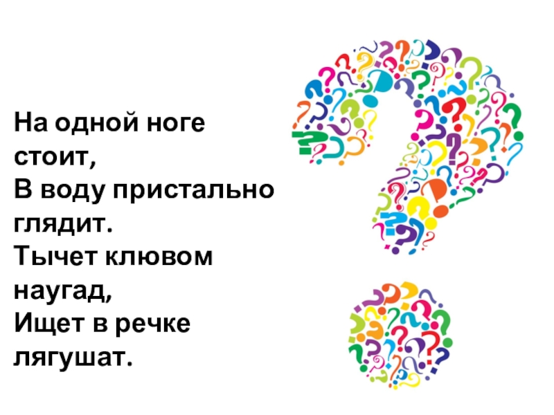 На одной ноге стоит,В воду пристально глядит.Тычет клювом наугад,Ищет в речке лягушат.