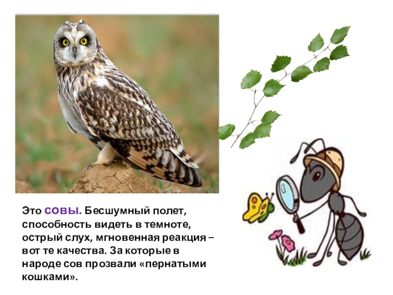 Слайд 6Это совы. Бесшумный полет, способность видеть в темноте, острый слух, мгновенная