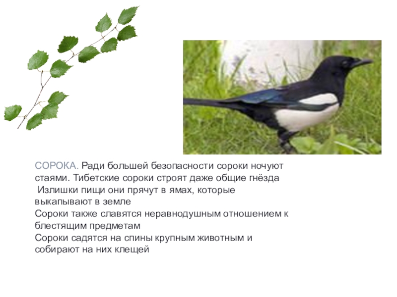 Слайд 9СОРОКА. Ради большей безопасности сороки ночуют стаями. Тибетские сороки строят даже