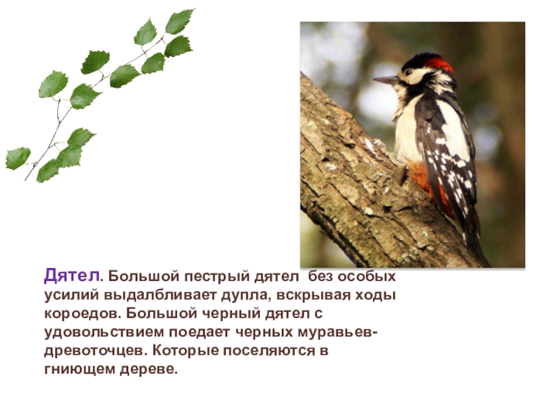 Слайд 8Дятел. Большой пестрый дятел без особых усилий выдалбливает дупла, вскрывая ходы