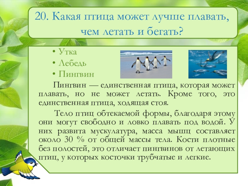 Слайд 2120. Какая птица может лучше плавать, чем летать и бегать?