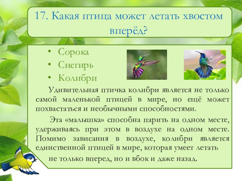 Слайд 1817. Какая птица может летать хвостом вперёд?