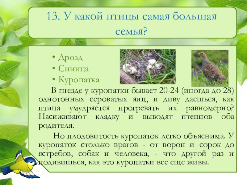 Слайд 1413. У какой птицы самая большая семья?