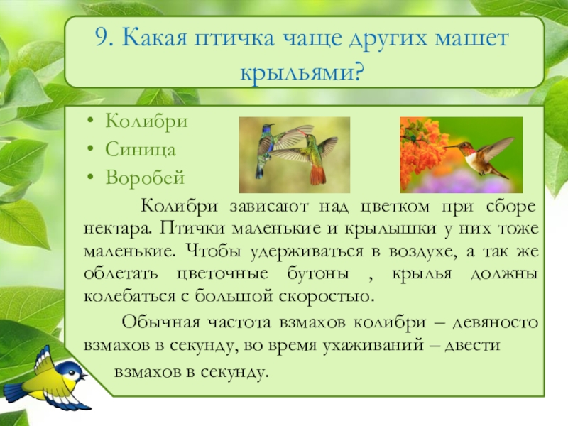 Слайд 109. Какая птичка чаще других машет крыльями?