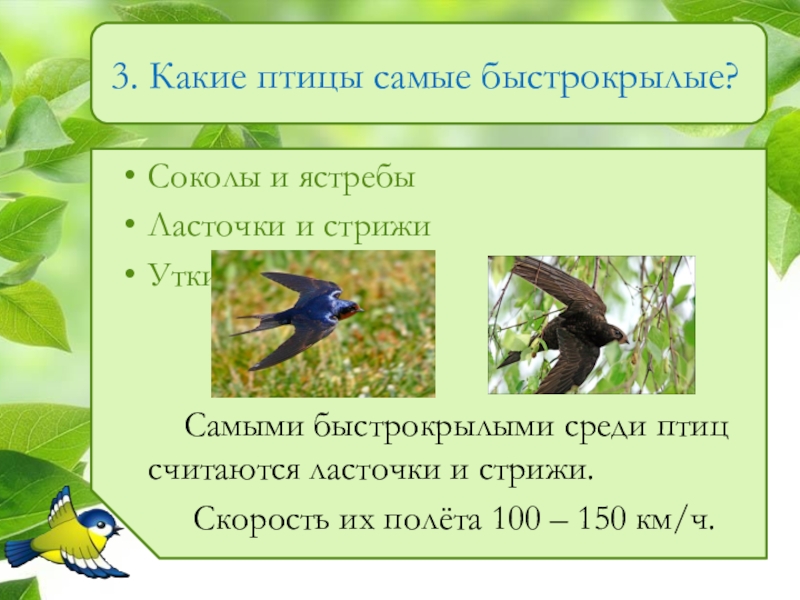 Самыми быстрокрылыми среди птиц считаются ласточки и стрижи.