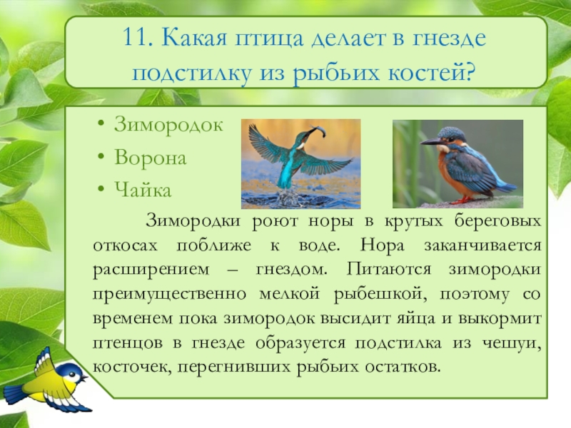 Слайд 1211. Какая птица делает в гнезде подстилку из рыбьих костей?